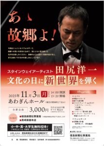 スタインウェイアーティストの称号を持つピアニスト田尻洋一さんのリサイタル「文化の日に『新世界』を弾く」を開催します。これまで公演活動は海外を含めて1,200回以上。本県での初公演でも聴衆を魅了した柔らかな美しい音色をご堪能ください。今回のテーマはショパン&ドヴォルザーク。祖国を離れた作曲家たちが、その魂を託した音楽の数々。偉人たちの想いを、田尻さんの渾身の演奏と、心に響くトークで紐解きます。