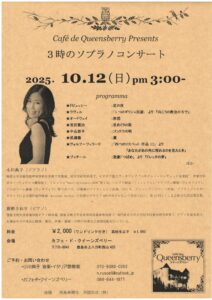 3時のソプラノコンサート 終了しました 音楽徳島市内 偶数月の2週目(日)15:00に開催。 10月はドビュッシーとラヴェルのフランス歌曲、日本の秋の歌、プッチーニの歌劇「つばめ」より『ドレッタの夢』他、をお送りいたします。 パンフレットはこちら 開催日 2025.10.12(日) 開催時間 開演15:00(開場14:00) 開催会場 カフェ・ド・クイーンズベリー 住所:徳島市上八万町西山425 入場料 一般 ¥2,000(1ドリンク付) 高校生以下 ¥1,000(1ドリンク付) お問い合わせ チケット取り扱い 小川典子 音楽・イタリア語教室 TEL:070-9386-0262 E-mail:n.ruscelli@outlook.jp