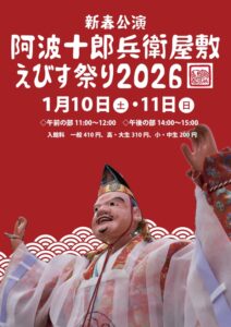 福の神・恵比須様が登場し、商売繁盛、家内安全を祈願する「えびす舞」、天下泰平・五穀豊穣を祈願する「三番叟」といった縁起の良い阿波人形浄瑠璃の演目を上演するほか、吉野川市鴨島町森藤地区に伝わる「獅子舞」と雨乞いを祈願する「傘踊り」などを上演。新年にふさわしい華やかで縁起の良い演目で、みなさまに福を届けます。