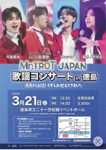 韓国発の大人気歌謡オーディション番組『ミスタートロットジャパン』より誕生したTOP5メンバーによる歌謡コンサート!本公演は、同番組初代優勝者である島 憂樹の出身地・徳島で開催される特別公演。島 憂樹が生まれ育ったこの地にメンバーが集結、この日限りの特別な選曲で構成されたスペシャルコンサート
